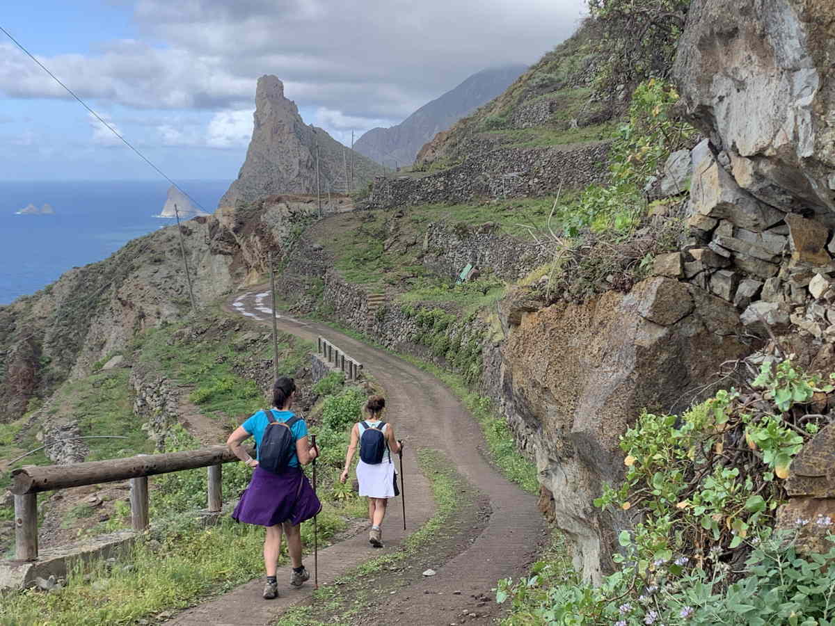 The hike can be divided into three parts: the hike up to the saddle from Taganana in dense vegetation, a long downhill to the beach, and then a traverse along a headland back to town. The second section is the most varied, with dramatic peaks, remote hamlets, and lovely gardens set in challenging locations. This hike is simply stunning in all its parts! We chat with some other hikers along the way, variously from Romania, Italy, and Germany.